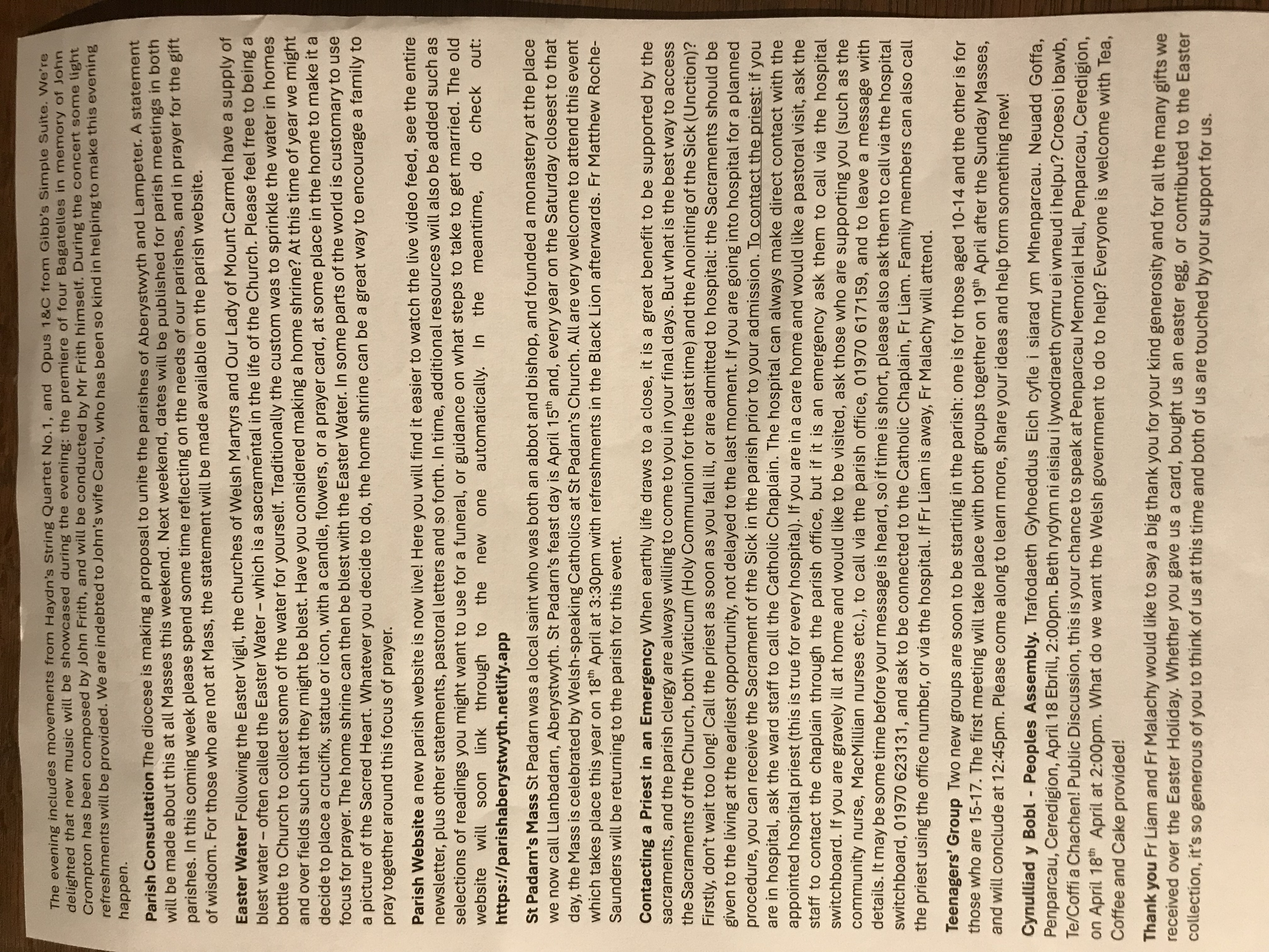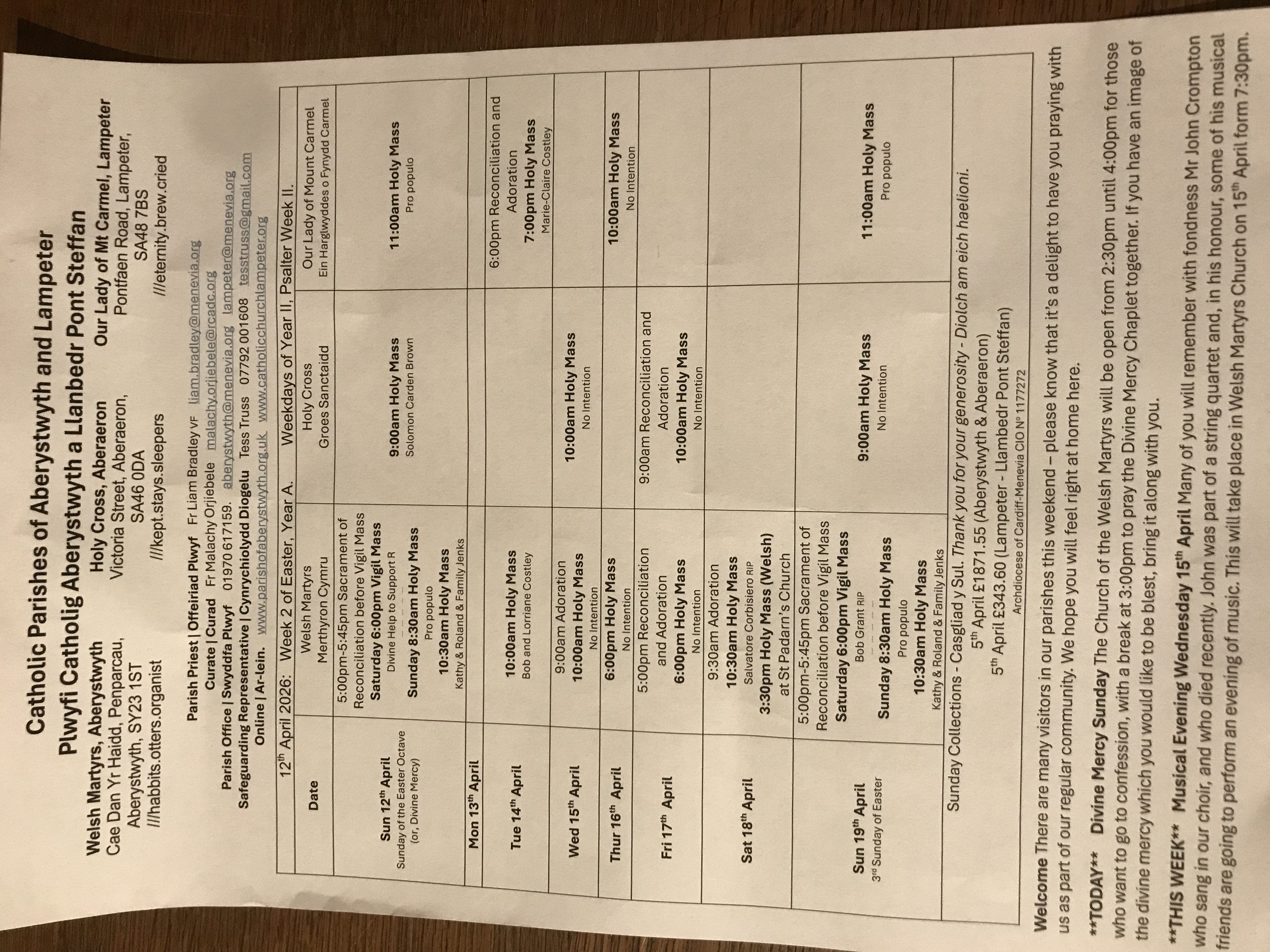 Please see https://ceredigioncatholics.org/ for weekday Mass times, or contact the parish administration team based in Aberystwyth.