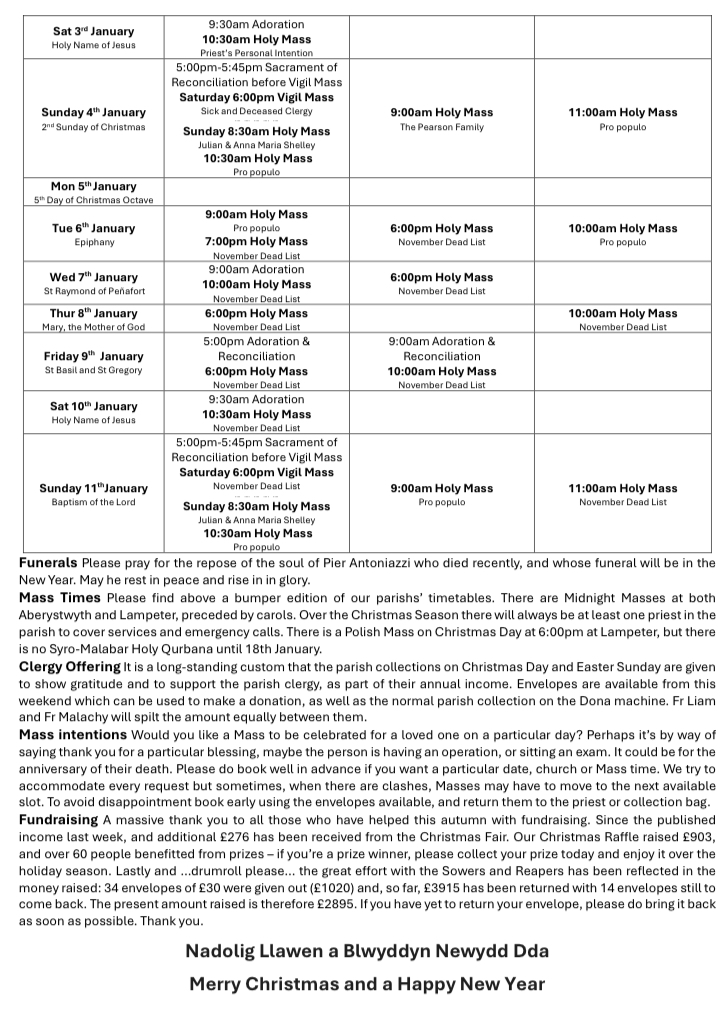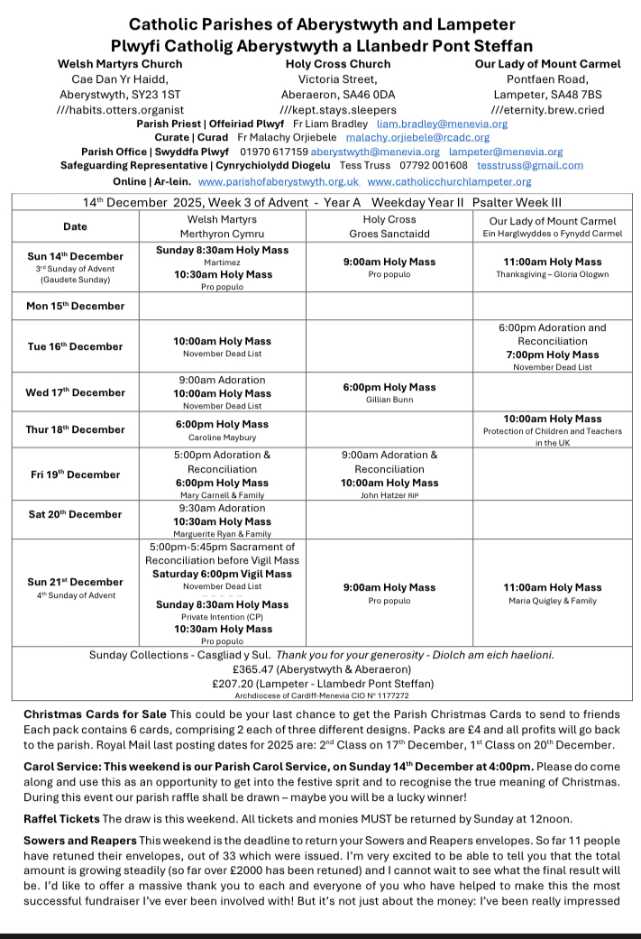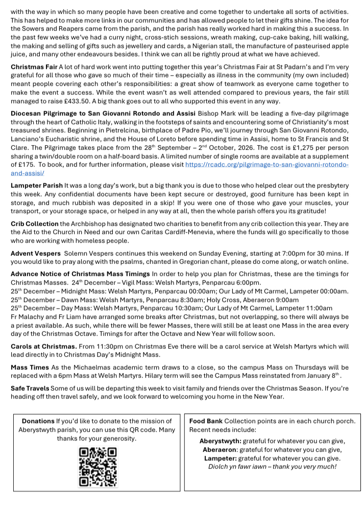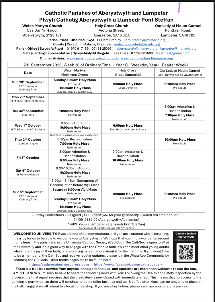 Holy Mass is scheduled for every Sunday in Lampeter at 11am