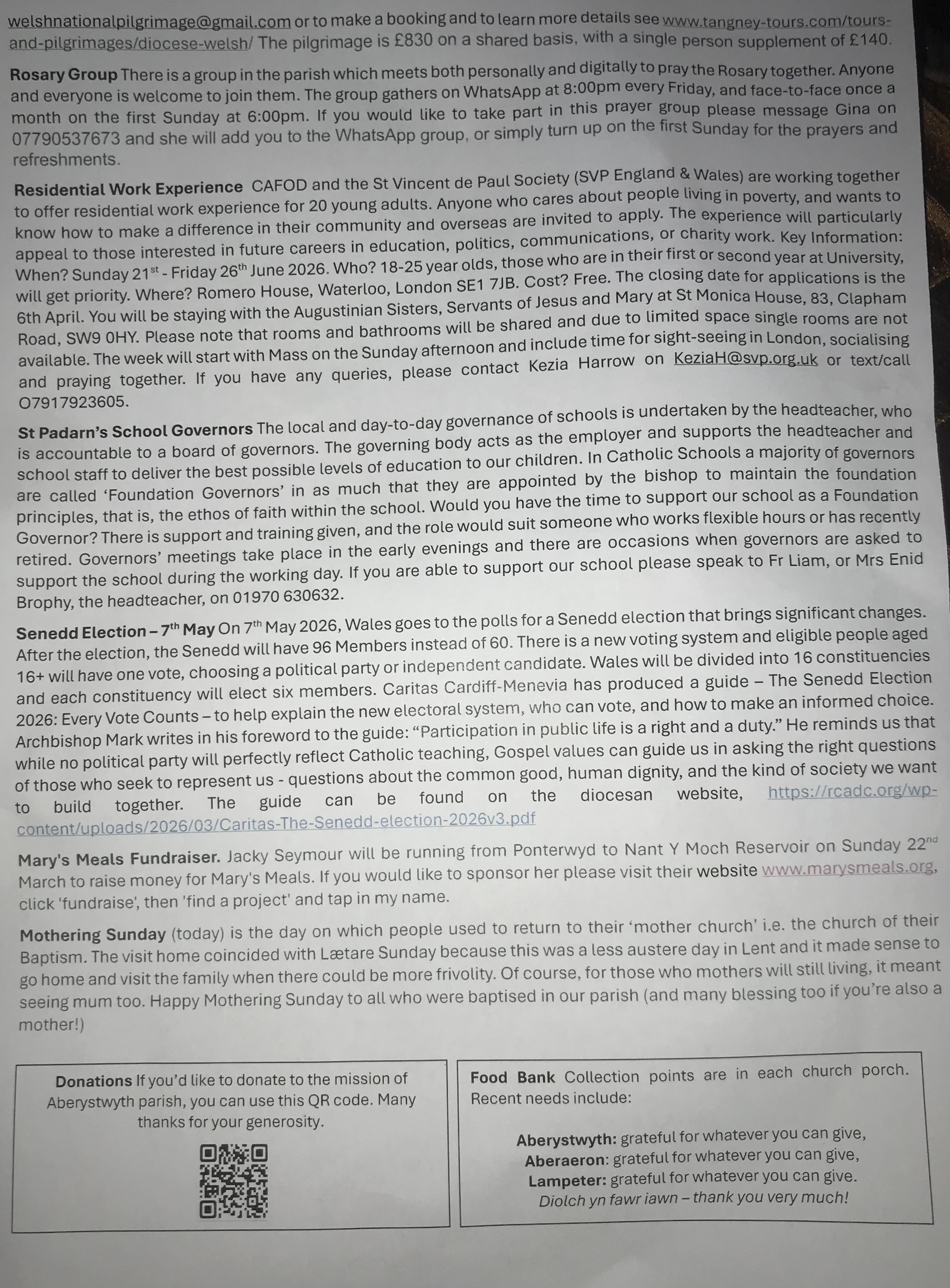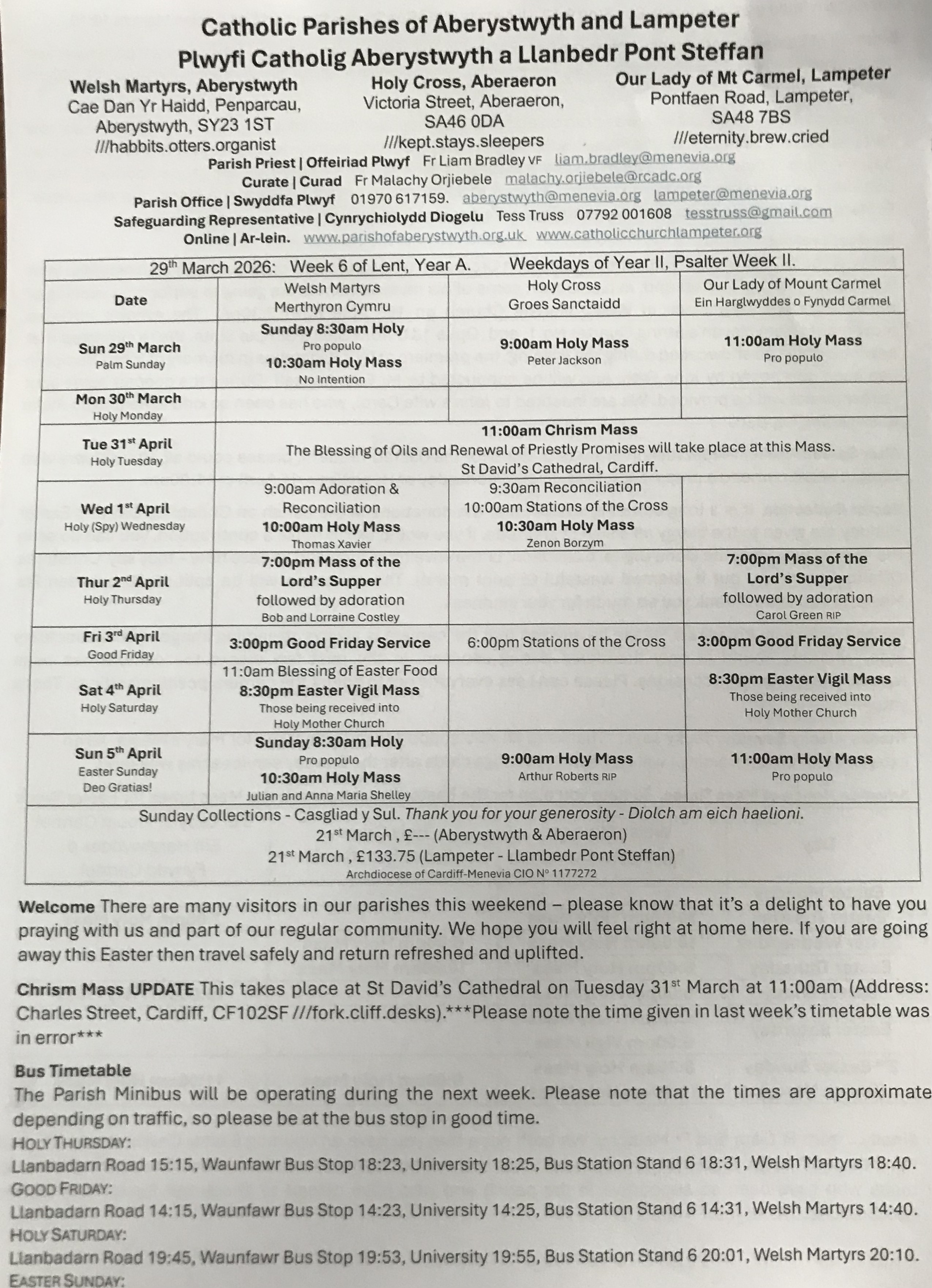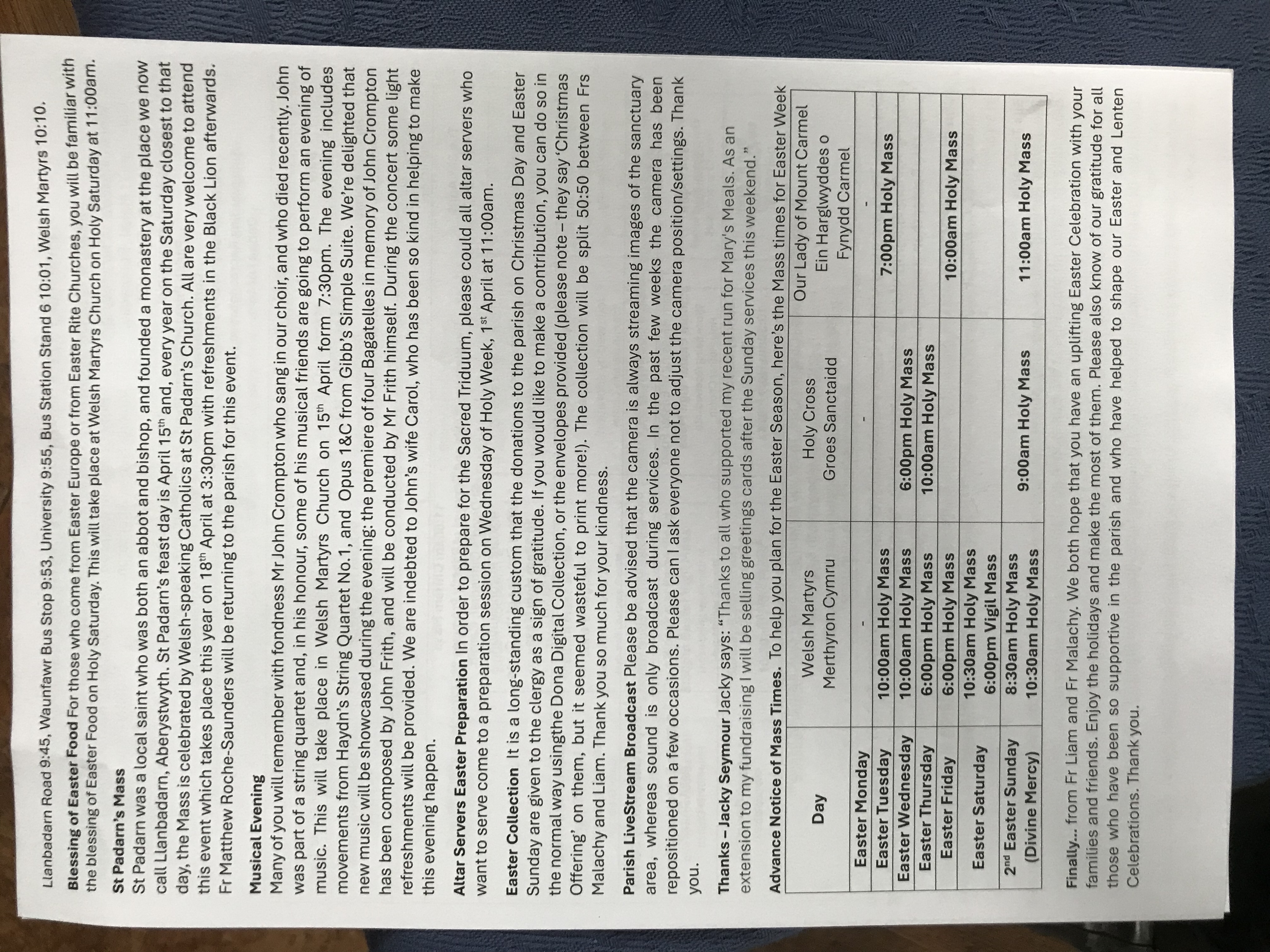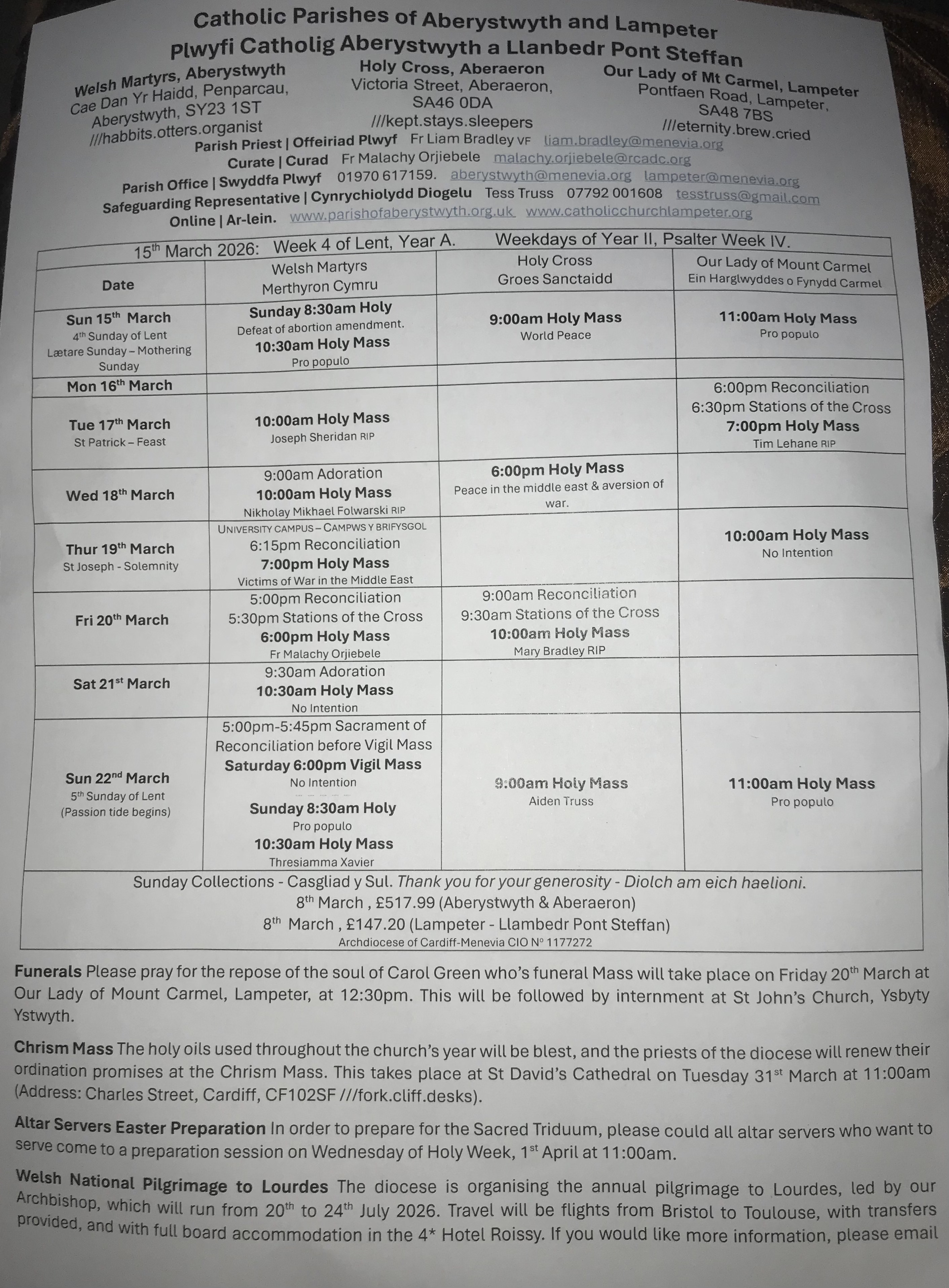 Please see https://ceredigioncatholics.org/ for weekday Mass times, or contact the parish administration team.