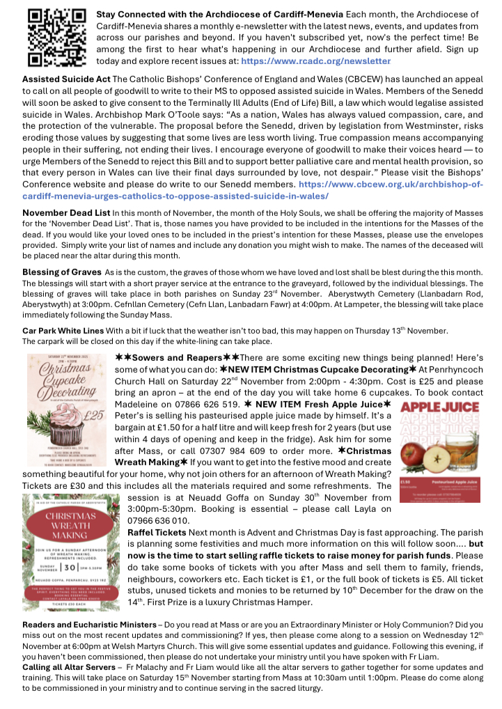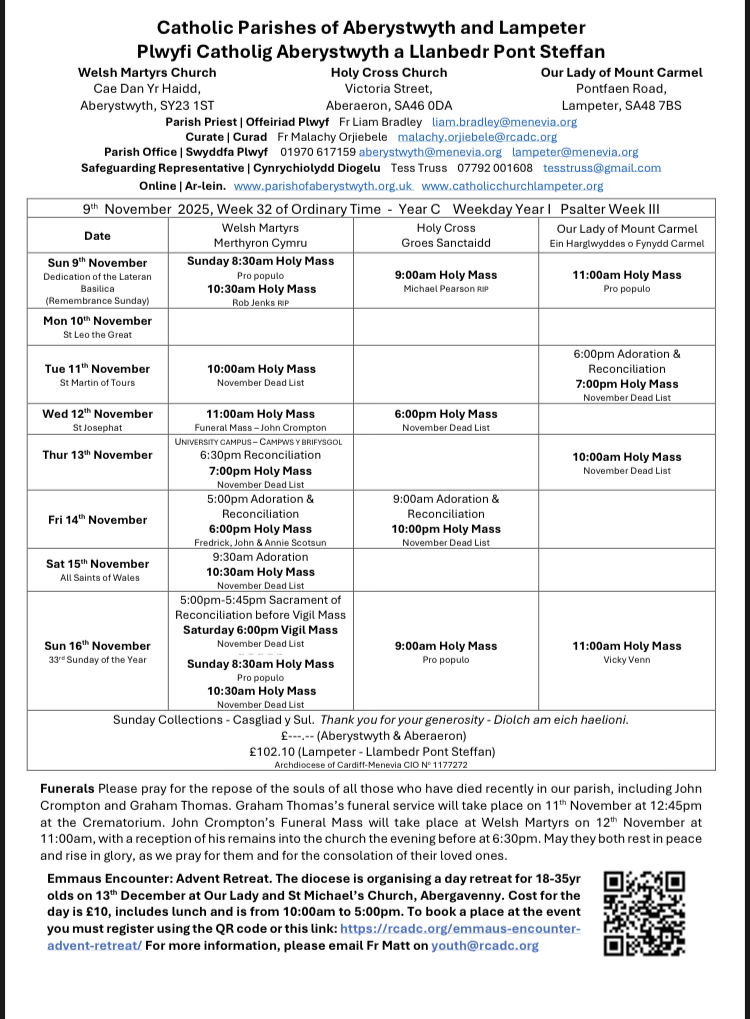 Holy Mass is scheduled for every Sunday in Lampeter at 11am